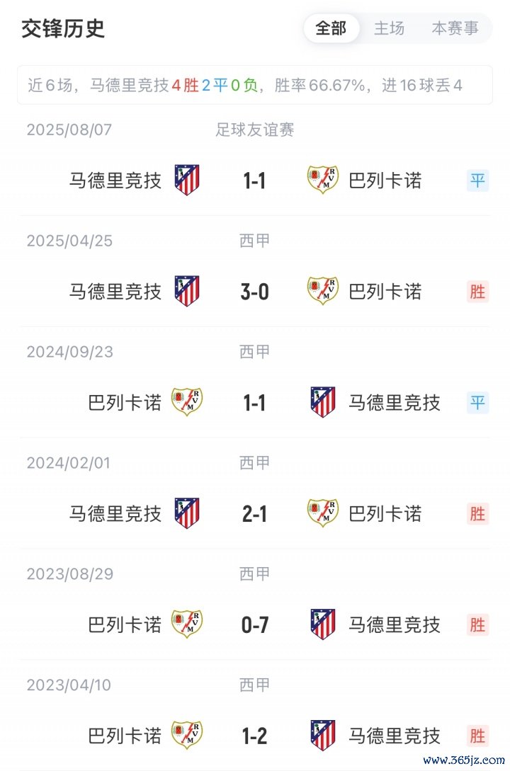 马竞职业联赛 1胜3平1负暂位西甲第12, 田径新闻足球直播吧近2场不胜;巴列卡诺1胜2平2负积5分暂位第14,运动天地家园近3场不胜。马竞各赛事对阵巴列卡诺已连续18场不败(14胜4平)。