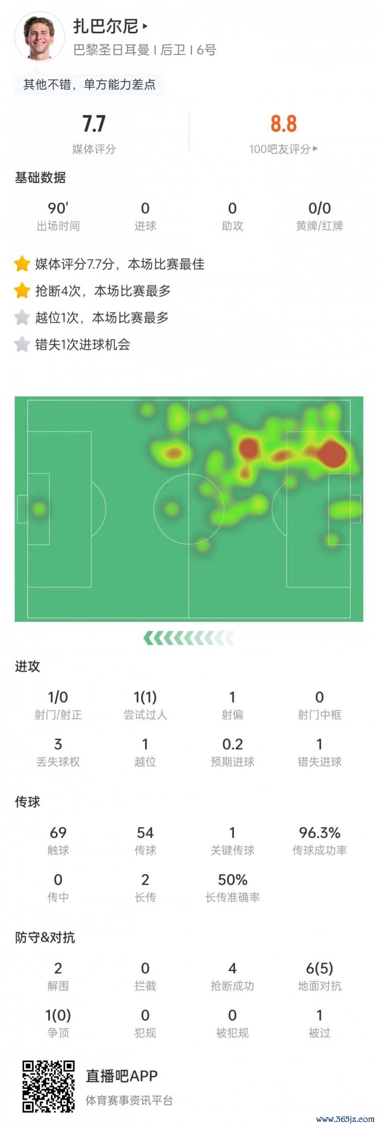 扎巴尔尼数据:7次对峙 5次成功+4次抄截 2次解围,7.7分全场最高