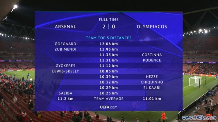 本场赛事 阿森纳球员移动距离 最长情况如下: