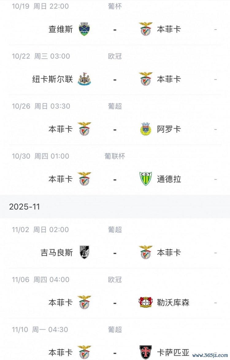 在10月国际赛事 日结束后,本菲卡10月19日在葡杯第三轮客场应战 应战 查维斯,22日迎来欧冠客场应战 对阵纽卡的赛事 ,运动天地家园26日的葡超回到主场作战 对阵阿罗卡。