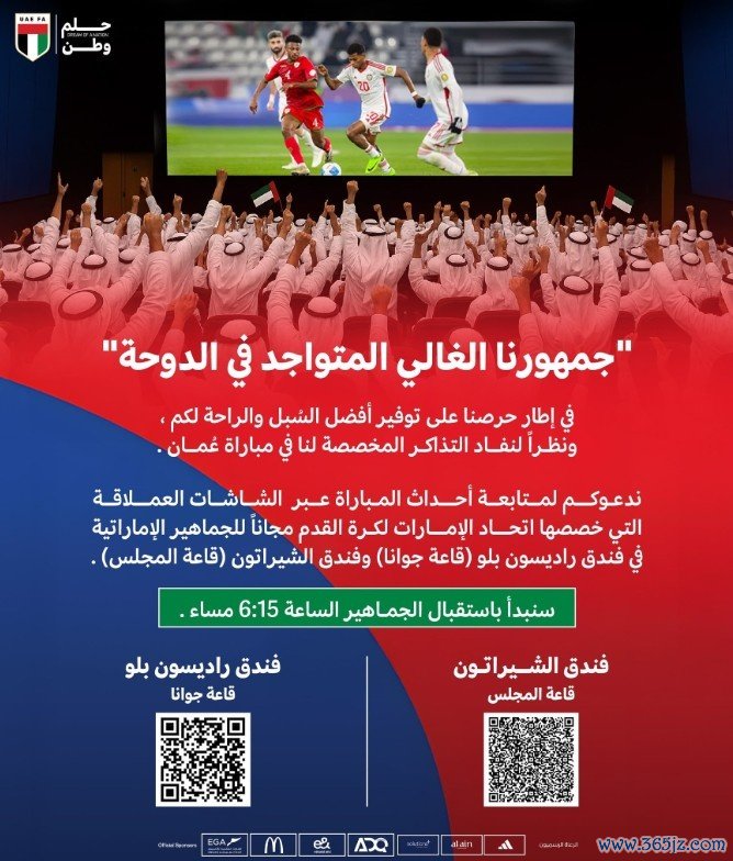 我们邀请您在阿联酋古代足球 协会为阿联酋球迷免费提供的位于丽笙酒店(乔安娜厅)和喜来登酒店(马吉利斯厅)的巨型屏幕上关注赛事 动态。我们将于18:15(22:15)开始接待公众中超。”