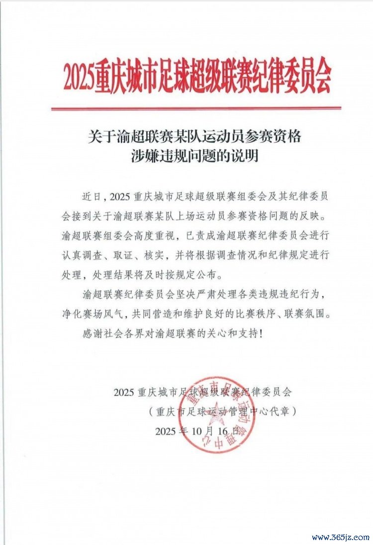 10月18日讯 据“封面新闻”报道,10月16日,2025重庆城市古代足球 超级职业联赛 组委会发布《关于渝超职业联赛 某队运动活动 员参赛资格涉嫌违规问题的说明》,确认正在调查某队运动活动 员参赛资格问题。随后,又有自媒体博主在社交平台,曝出一份“违规参赛处罚陈述通知”的文件。该文件直接点明,正在接受调查的某队为北碚缙云鼎久队,违规球员为李俊杰,他也出现在了2025中乙职业联赛 泉州亚新古代足球 俱乐部的球员名单上。