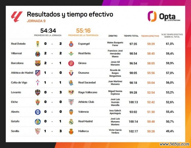 10月21日讯 OPTA统计了西甲第九轮各场赛事 的有效时间,没有任何一场赛事 的有效时间超过60分钟。