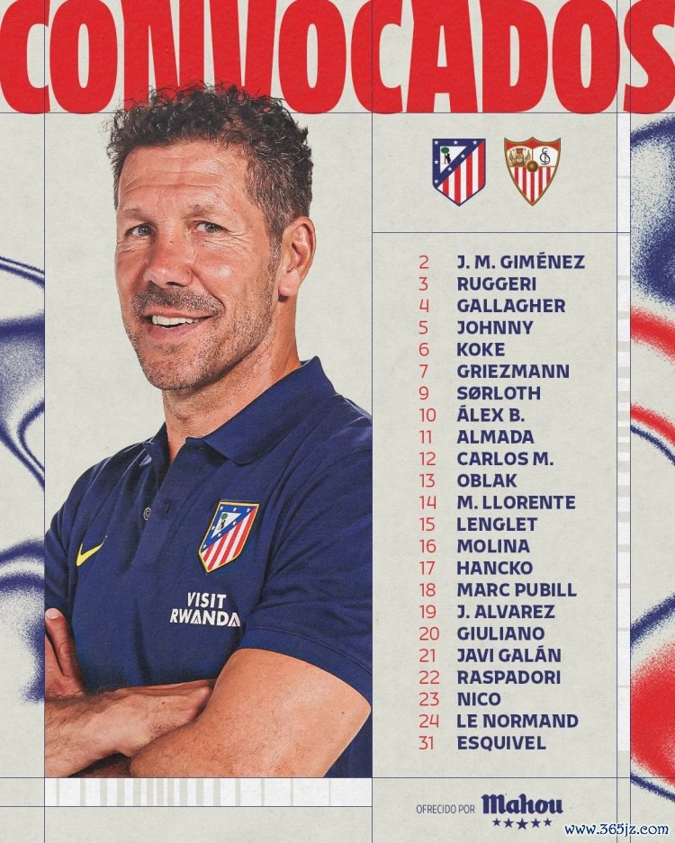 马竞主场作战 对阵塞维利亚大名单:格列兹曼领衔,巴里奥斯缺席