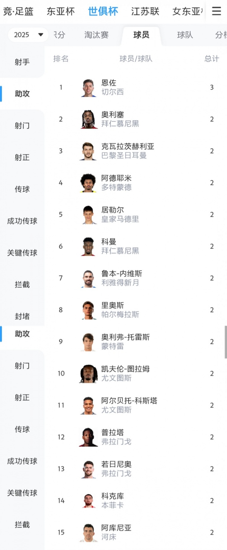 世俱杯助功 榜:恩佐3次领跑,阿诺德居勒尔维蒂尼亚等人两次