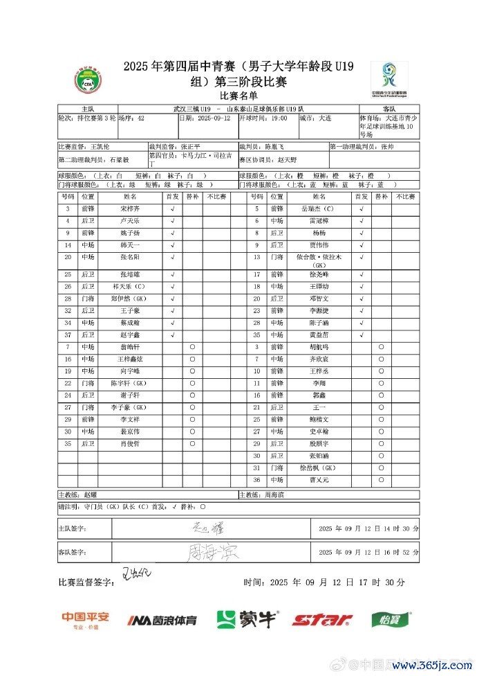 中青赛男子U19组总决赛 ,武汉三镇U19 vs 山东泰山U19杆位出炉