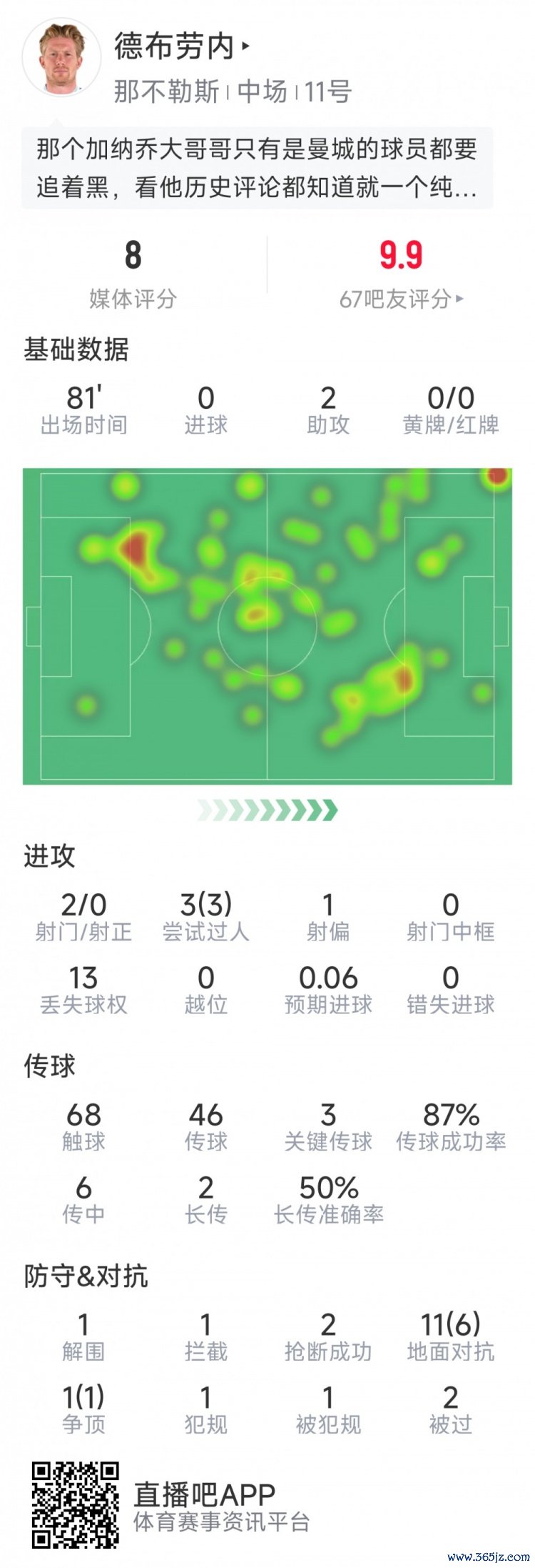 10月2日讯 在本轮欧冠那不勒斯对阵葡萄牙体育的赛事 中,德布劳内助功 双响, 田径新闻足球直播以下为他在本场数据: