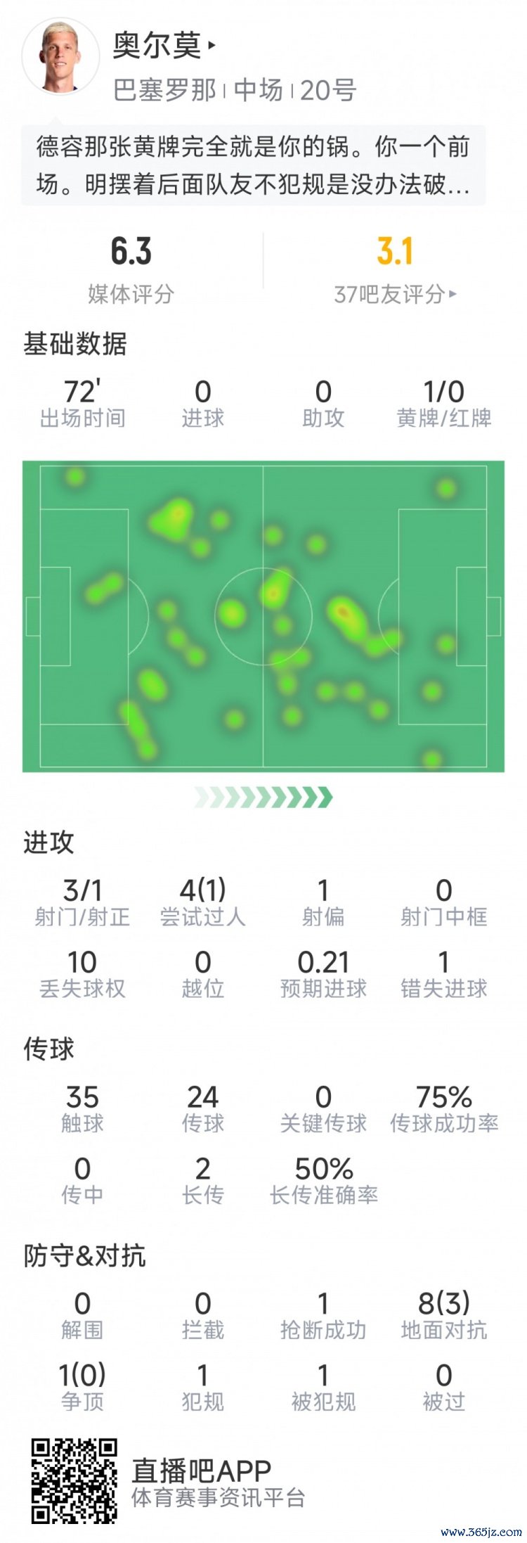 10月2日讯 在本轮欧冠巴萨对阵巴黎的赛事 中,奥尔莫杆位出场, 中超在线直播以下为他在本场数据: